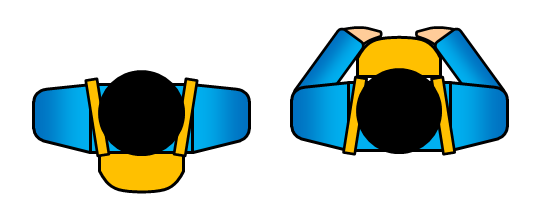 左側が普通に背負った状態を上から見た図です。人間の肩は前に背負うとリュックが落ちていってしまう形状なので、手で押さえることになるんです。それが右側。どちらがスペースを食ってますかということですよ。